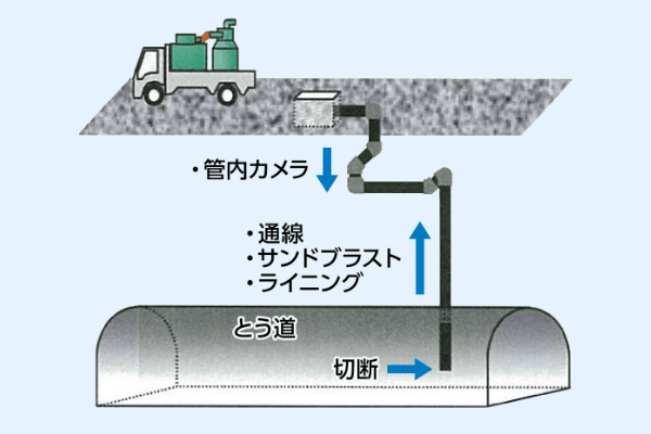 とう道内設備の排水管は、経年劣化により腐食が進行し、管内面の錆こぶによる排出機能の低下や腐食孔による管外(地中)への漏水などが発生します。本技術は、排水管内面を小型カメラで確認し、錆を除去。非開削で点検・診断~ライニングまで行います。