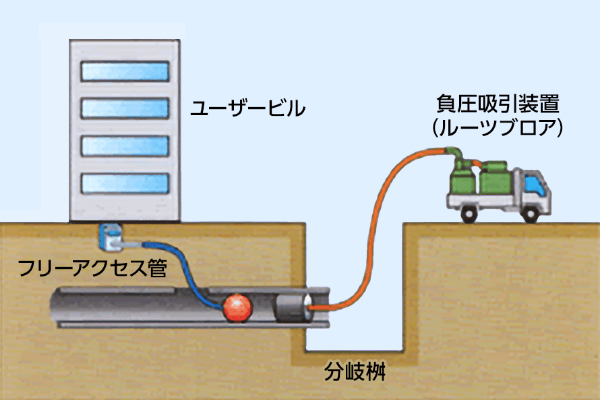 地下管路の情報通信ケーブル敷設を負圧空気を利用して行うことにより、一日の敷設延長を飛躍的に延ばし、工期短縮・トータルコスト削減を達成します。