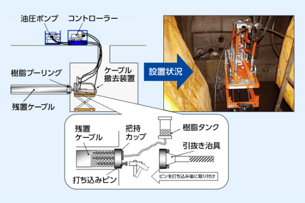 地下管路に残置されたケーブルを専用のケーブル撤去装置を用いて容易に撤去します。